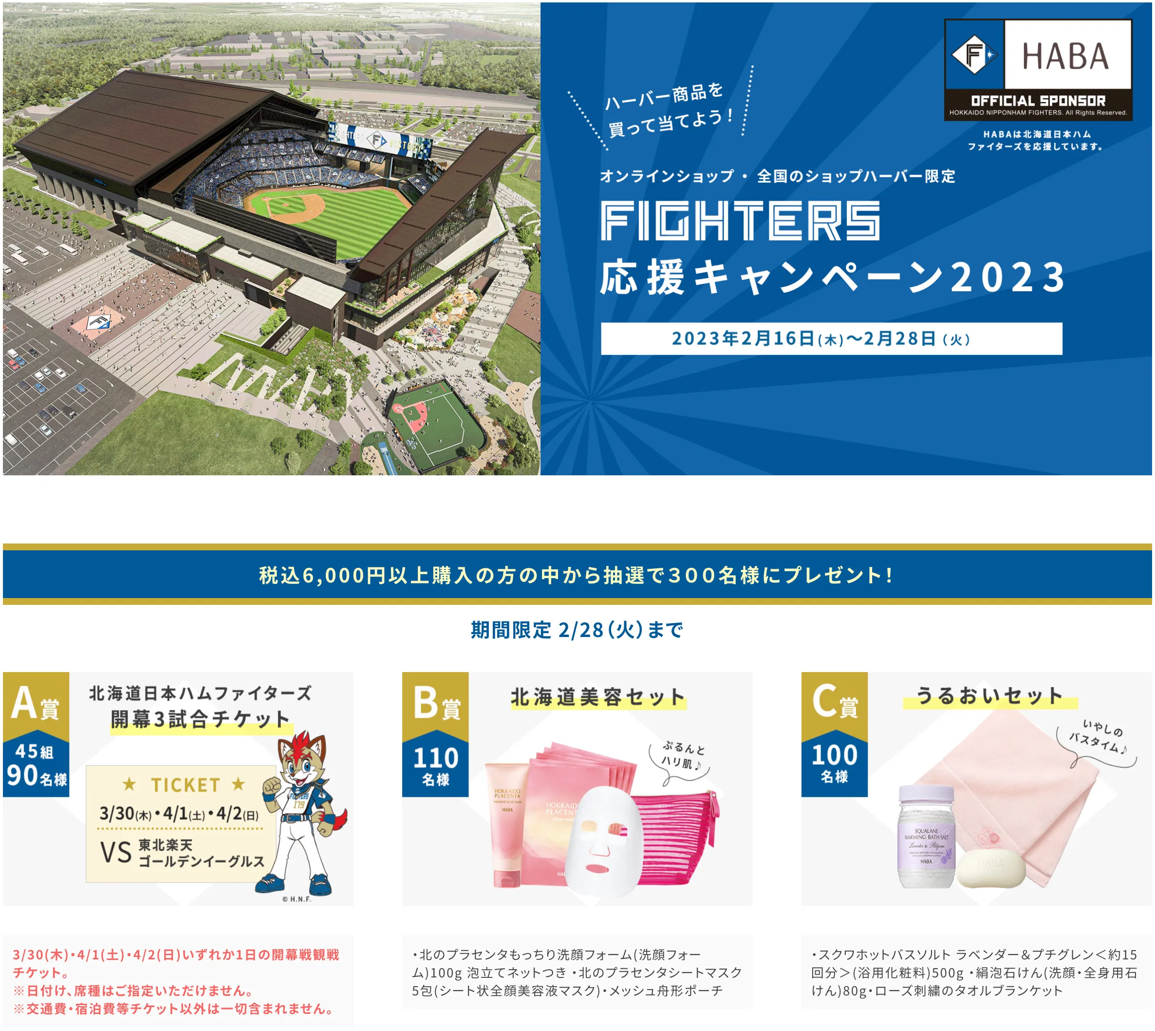当企画は、2023年3月に北海道に開業する新球場「エスコンフィールドHOKKAIDO」での開幕戦観戦チケットをはじめ、ハーバー商品などが当たるキャンペーンです。