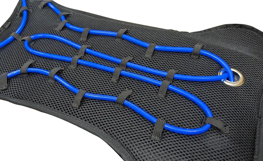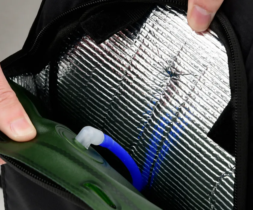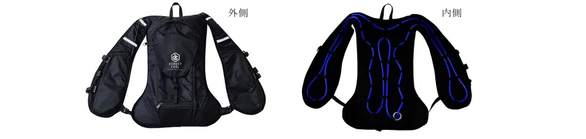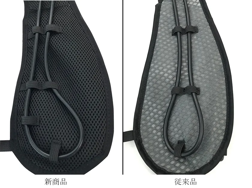 従来品にはなかったクッション材を内側に採用しました。このクッション材により、チューブが若干埋まり、背中の異物感を軽減することができます。また、身体に接している部分以外のチューブも空気に触れにくくなるため、結露を防ぐことができます。