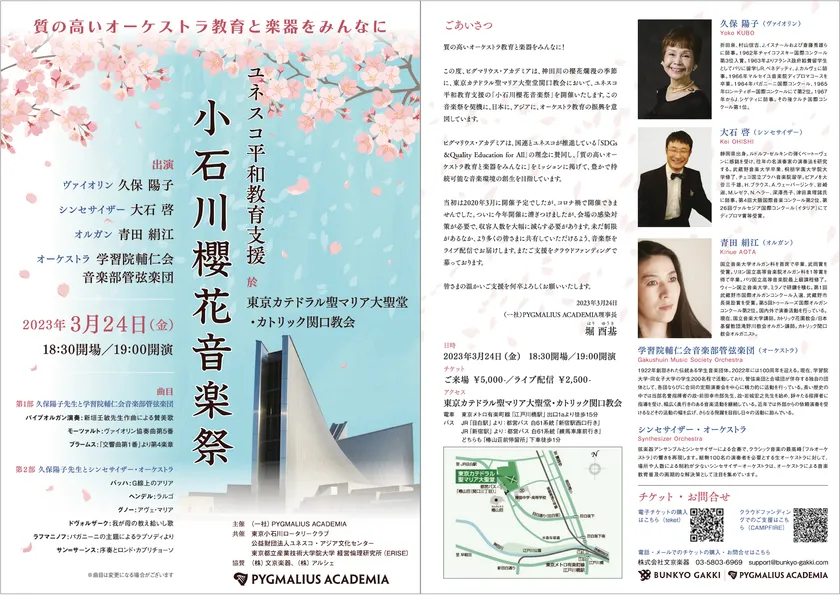 この度、オーケストラ教育の理念を体現するべく、ユネスコ平和教育支援「小石川櫻花音楽祭」(日時:2023年3月24日(金)19:00~ 場所:東京カテドラル聖マリア大聖堂)で開催することになりました。ソリストには、日本を代表するヴァイオリニストの久保陽子さんをお迎えし、カテドラルと同じ地域の学習院輔仁会音楽部管弦楽団と共演します。