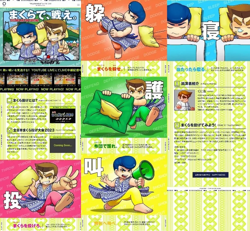 伊東市(庁舎:静岡県伊東市、市長:小野 達也)は、3年ぶりの開催となる「まくら投げ大会in伊東温泉」を記念して、アークシステムワークス株式会社(神奈川県横浜市、代表取締役:木戸岡 稔)が展開するゲームタイトル「熱血硬派くにおくんシリーズ」とコラボレーションした「全日本まくら投げ大会in伊東温泉」の公式サイトを2023年2月20日より公開いたしました。