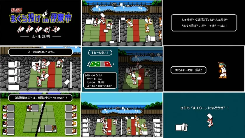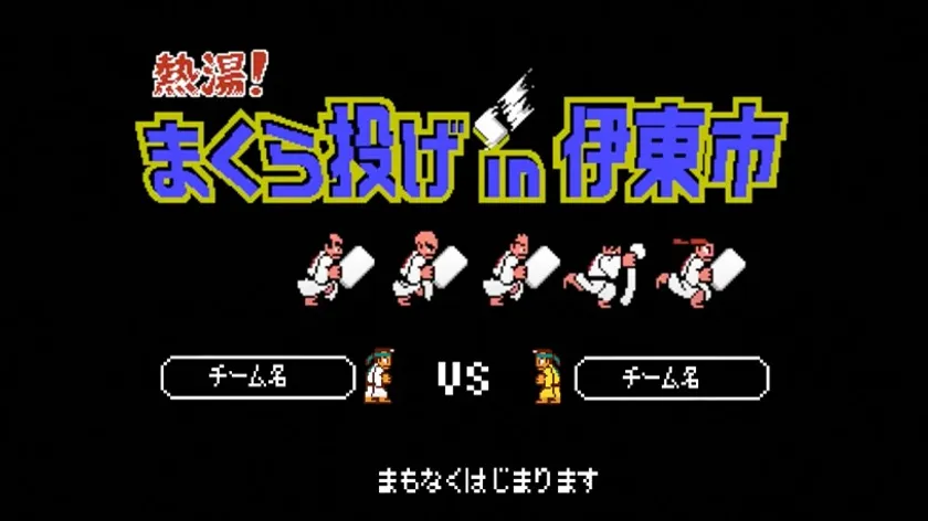 コロナ禍の影響で2020年2月の大会を最後に中止を余儀なくされていました本大会ですが、2023年2月25日(土)・26日(日)に3年ぶりの開催が決定したことを受け、再度まくら投げ大会を盛り上げるべく、「全日本まくら投げ大会in伊東温泉」の公式サイトを熱血硬派くにおくんバージョンにリニューアルを行い、2021年に公開した、くにおくんのキャラクターがまくら投げのルール説明をする動画『熱湯!まくら投げin伊東市』や、スポーツとしてのまくら投げのイメージビジュアルを公開いたしました。並行して、実際にくにおくんのキャラクターを操作してまくら投げを楽しめる「熱湯!まくら投げin伊東市」のゲーム化も進行していますので、お楽しみに。
