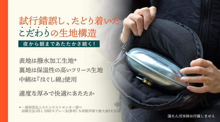 「湯たんぽに付属しているケースが心もとない」「かっこいいカバーが無い!」という社内の声から開発がスタートしました。幾度と試作を繰り返すうちに「お湯が冷めにくい」「キャンプサイトに溶け込みやすいデザイン」「やけどが防げるもこもこ手触り」のカバーが完成しました。