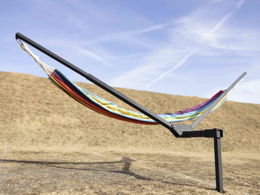 車のヒッチメンバーや建物の柱、木の幹などに取り付けたり、地面に挿し込んだりして設置する「ハンモックアーム」は、日本初(*当社調べ)の完全国産品。パウダーコーティング塗装(粉体塗装)を施し、高い耐久性を備え、コンパクトに収納できるのが特長です。アウトドアでの新しい空中空間の過ごし方を提案します。