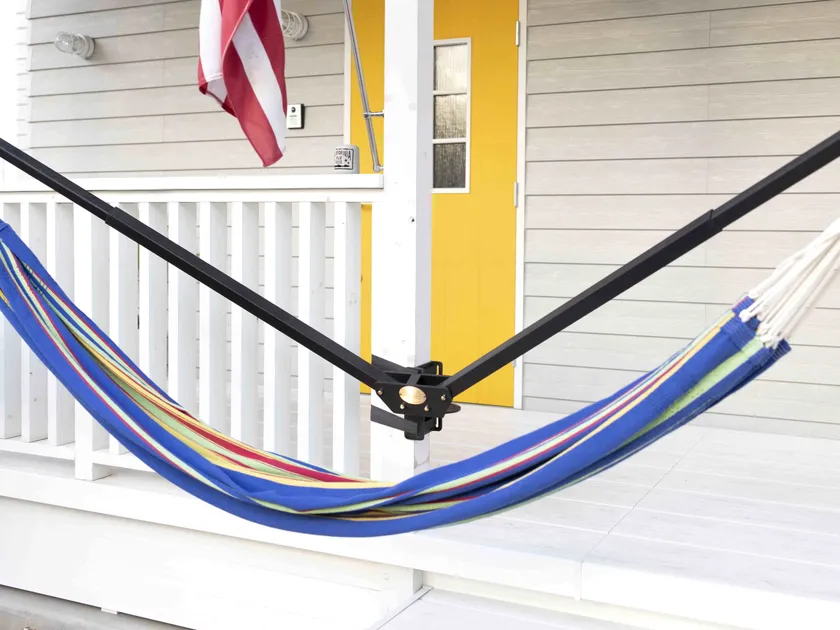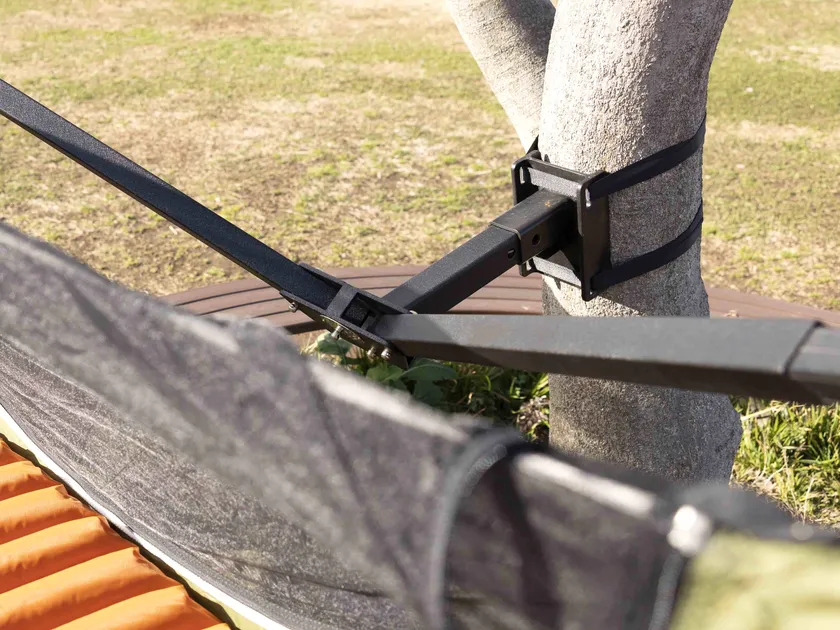 車のヒッチメンバーや家の柱、木の幹と「サニーハンモック」があれば、そこはもうハンモック空間。オプションの「ムーバブルブラケット」を取り付ければ柱に固定した状態で180度回転可能になります。急な雨や陽の光が差し込む位置によって好きなように向きを変えることができます。