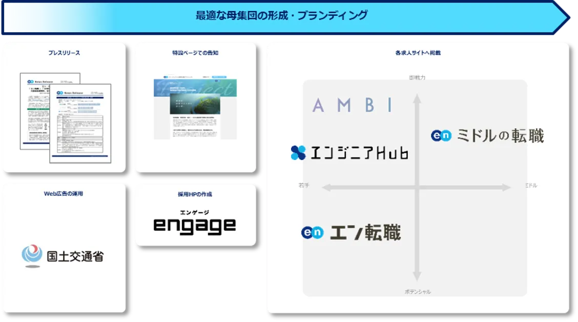プレスリリースや特設ページ、『engage』を用いた採用HPの作成、Web広告を用いた告知に加え、各求人サイトでの集客サポートを実施いたします。『エン転職』『AMBI』『ミドルの転職』『エンジニアHub』とターゲットの異なる4つの求人サイトを活用することで、ターゲットへ網羅的に求人を届けます。