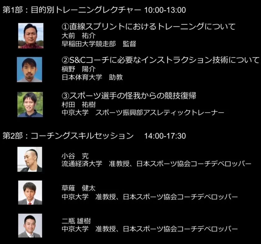 本クリニックでは、様々な競技スポーツでの知見をベースにトレーニング指導方法及びコーチングについて、理論と実践を連携したノウハウを1日で学ぶことができます。当日は、午前に3つの目的に応じたレクチャーと実技、午後にはコーチングに欠かせないコミュニケーションスキルの向上を目的とした実践的セッションを開催します。第1部と第2部を通して参加される方は、ランチョンセミナーもご参加いただけます。また第1部と第2部を別個に参加することも可能です。当日は、TECHNOGYM東京ショールームにおいて、SkillrunやBiostrength等アスレチックパフォーマンス向上のためのトレーニングに最適なTechnogymフィットネス製品を体験いただけます。