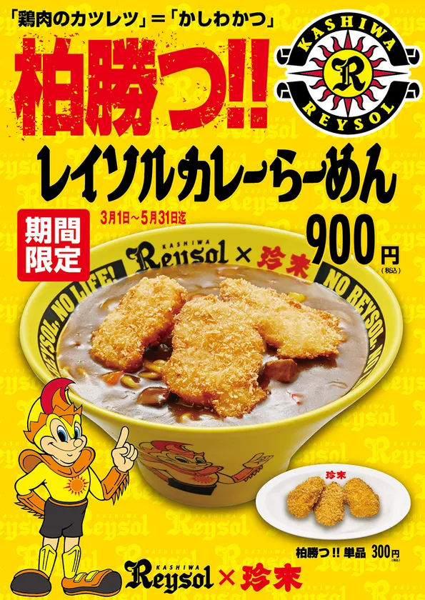 株式会社珍來(本社:千葉県船橋市二和東6-21-5、代表取締役社長:清水 延年、以下(株)珍來)は、Jリーグ 柏レイソルとのコラボ企画2023として、「柏勝つ!!レイソルカレーらーめん」(900円・税込)を、(株)珍來直営店(9店舗)で2023年3月1日から5月31日までの3ヶ月間限定販売します。