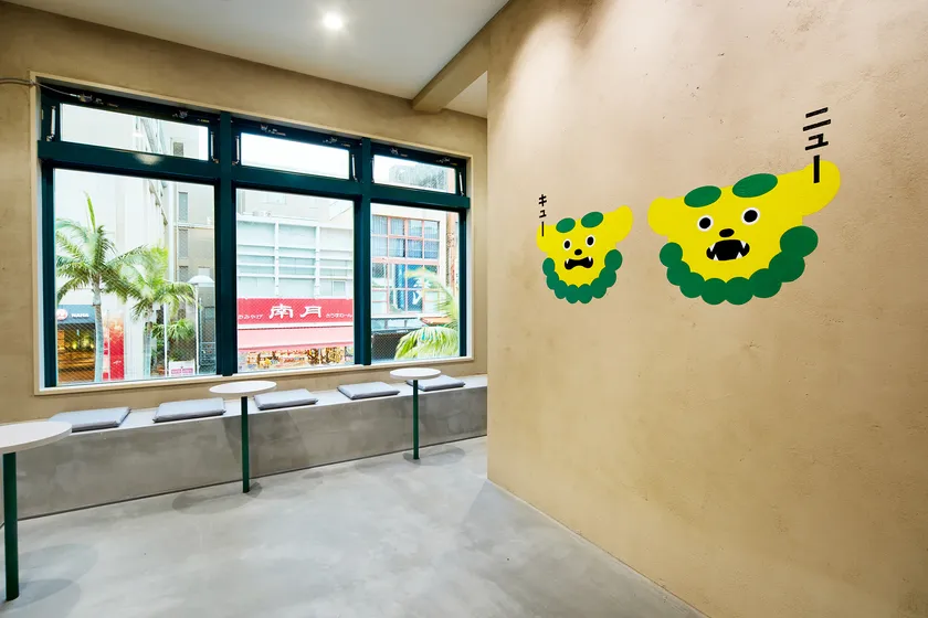 時代性を反映し2階イートインスペースにはフォトスポットを用意。newQカラーのシーサーがお出迎えします。旅行の思い出作りの一助になると共に、買って終わりではない体験のある店舗空間を目指しました。