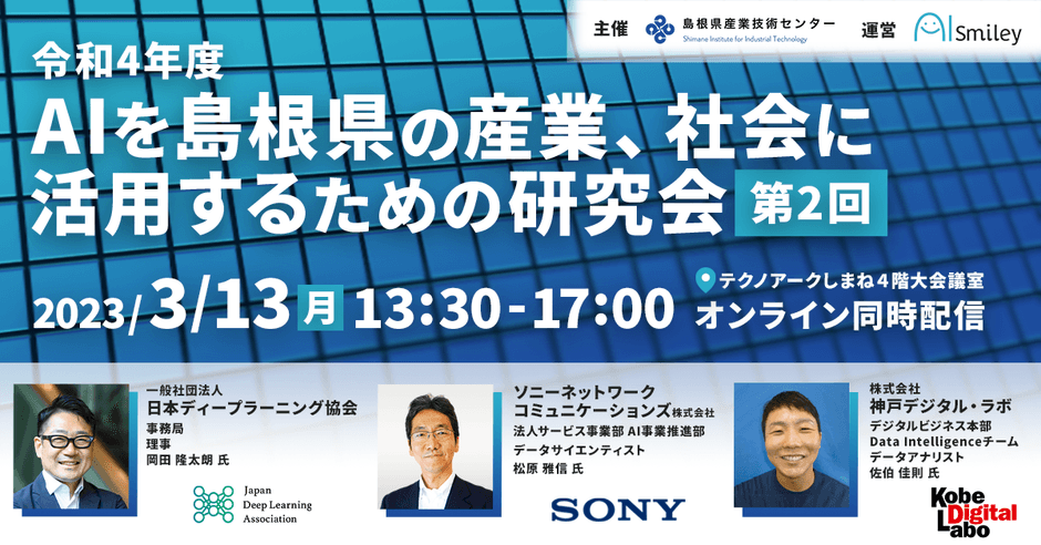 JDLA、ソニーネットワークコミュニケーションズ、神戸デジタル・ラボ登壇!島根県産業技術センター主催「令和4年度 AIを島根県の産業、 社会に活用するための研究会 (第2回)」が3月13日(月)に開催