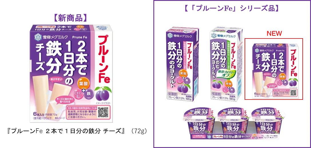 雪印メグミルク株式会社(本社:東京都新宿区、代表取締役社長:佐藤 雅俊)は、『プルーンFe 2本で1日分の鉄分 チーズ』(72g)を2023年3月1日(水)より全国にて新発売いたします。