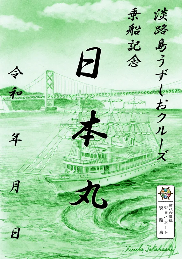 御船印は、神社仏閣めぐりで集められる御朱印の船バージョンで、日本各地の船をめぐる今までにない楽しい船旅をお楽しみいただけます。デザインは、海洋画家の高橋 健一氏が「世界最大級の渦潮・鳴門海峡」と「世界最大級の吊橋の明石海峡大橋・明石海峡」に就航している、日本有数の大型遊覧船「咸臨丸」と「日本丸」の航海する様子を、鉛筆画で表現いたしました。