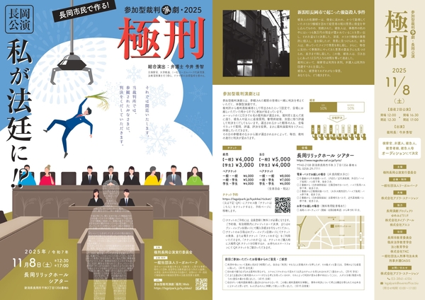 参加型裁判演劇「極刑」長岡公演が2025年11月8日 (土)に長岡リリックホール シアター(新潟県 長岡市 千秋 3丁目1356番地6)にて上演されます。