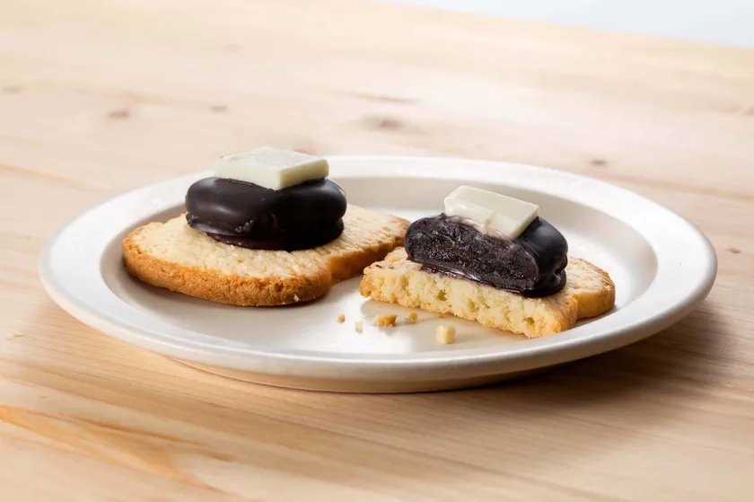 見た目はまるで小倉あんとバターをのせた“焼きたてトースト”。『珈琲所コメダ珈琲店』の小倉トーストの味わいが、おいしいサブレになりました。素材にもこだわって、北海道産あずきを使用。チョココーティングした特製小倉あんを、パン粉を練りこんだバター香るトースト型サブレの上にのせました。