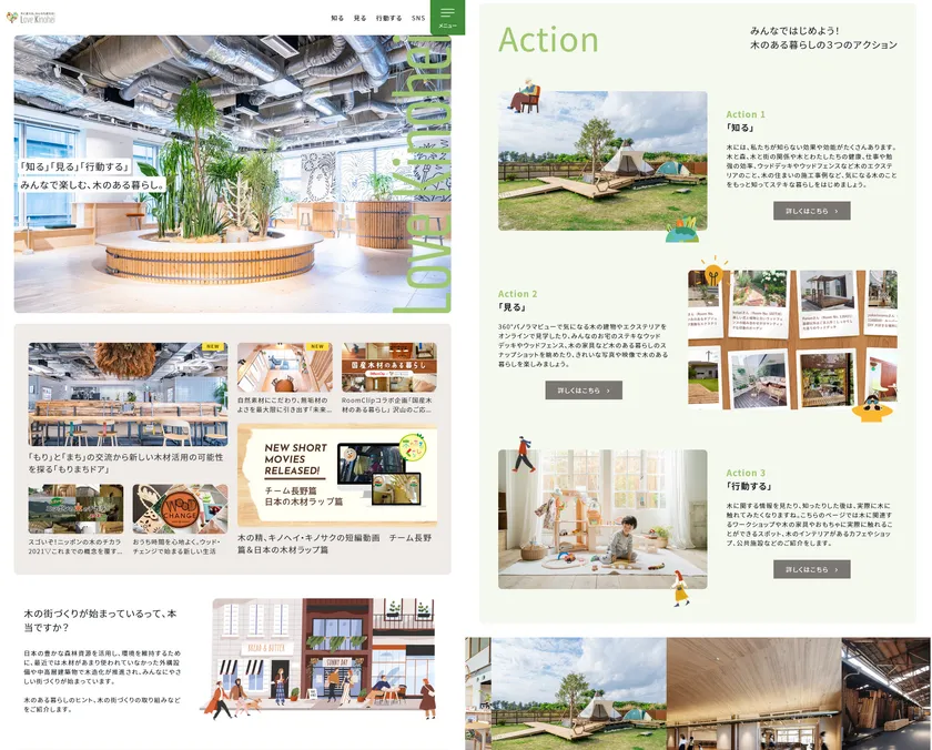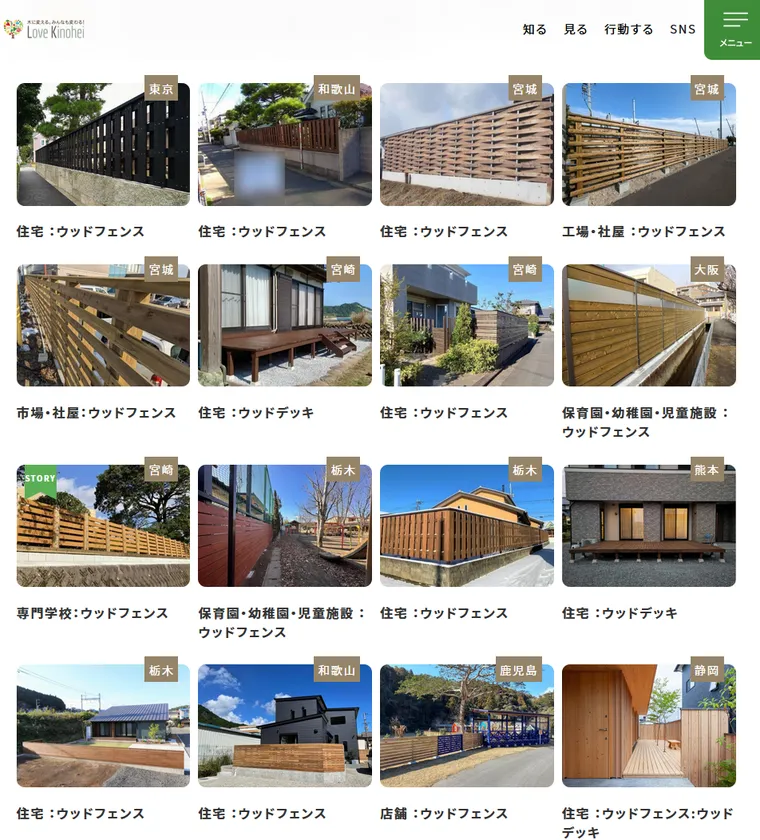 そこで、ラブキノヘイでは、これまであまり使われてこなかった木の塀(ウッドフェンス)やデッキ、カーポートなどのエクステリアでの導入事例を中心に、木の家や、国産材を使った雑貨や、都市部の施設等での木材利用など、“木のある暮らし・木の街づくり”のヒントとなる情報を「知る」「見る」「行動する」の3アクションごとに、ご紹介しています。
