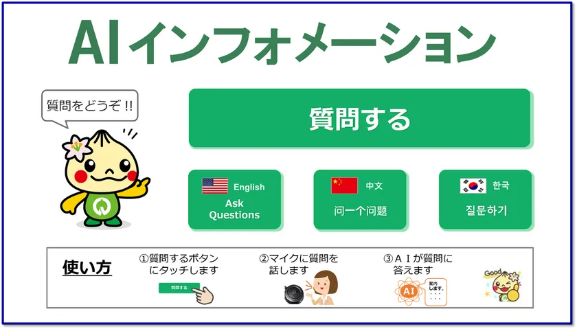 コミュニケーションインタフェースとして、音声(認識・発話)と画面(32インチタッチパネル)を装備しています。八百津町役場に関する情報を学習したAIを用い、音声と画面を通じ、来庁者に各種案内をわかりやすく行います。
