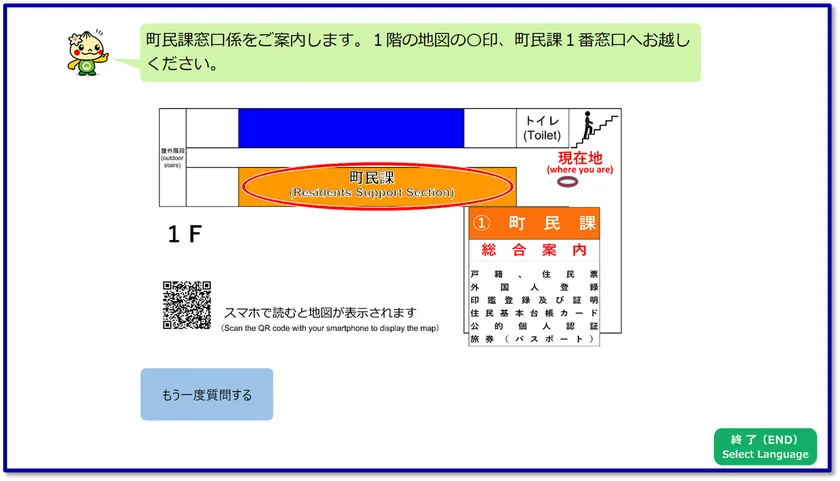 来庁した目的を伝える(話し掛ける)と、担当課・担当窓口を音声と画面で案内します。