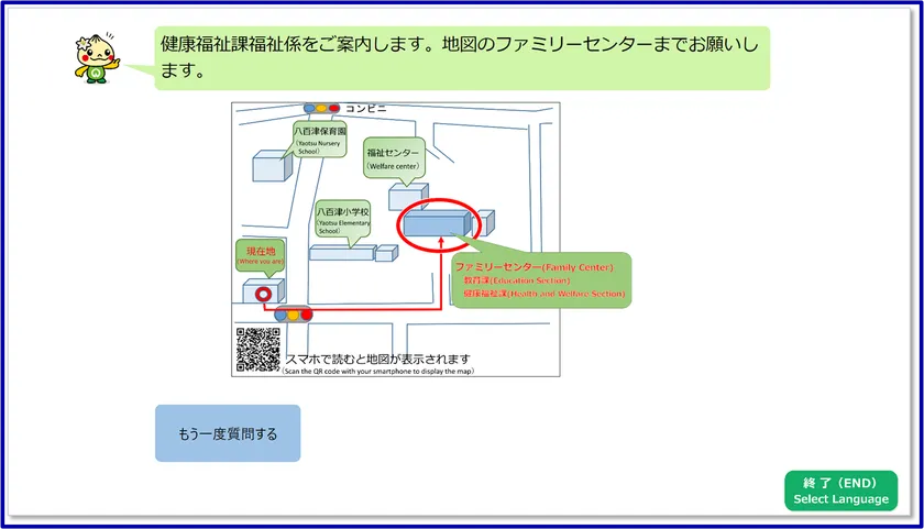 担当課の場所は地図を表示するとともに、二次元コードを表示し、スマホで地図を表示することができます。