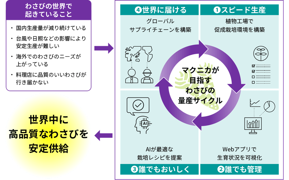 NEXTAGEは、日本の食文化において貴重かつ海外においても需要が増えているわさびの供給を補うため、屋内閉鎖型環境による安定生産が可能な植物工場の開発を進めてきました。従来のレタスなどの葉菜類の植物工場では、大量生産、大量販売をしないと収益性の担保が困難でしたが、促成栽培により栽培期間を短縮することでコンパクトながら収益の確保できるコンテナ型植物工場を実現しています。