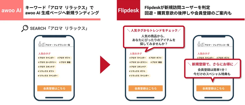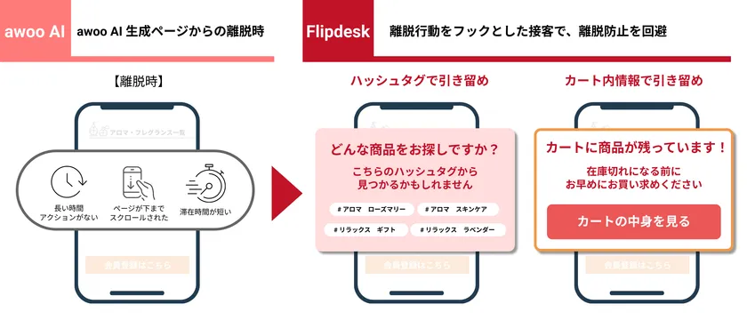 「Flipdesk」は、ユーザーの行動データ(訪問/閲覧/購買)をもとに趣味趣向を把握し、適切な情報訴求を行うWEB接客ツールです。「awoo AI」は、商品理解を通して回遊と購買を生み出すAIサジェストプラットフォームです。今回のシステム連携により、「Flipdesk」がECサイト上で収集・蓄積する行動データと、「awoo AI」が生成する商品の特徴を示すハッシュタグを掛け合わせた施策実施が可能となり、サイト回遊の促進とさらなる売り上げ向上に貢献します。