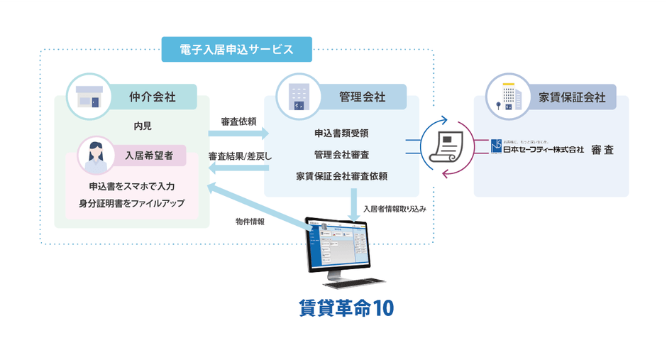 入居申込をオンラインで完結する日本情報クリエイトの「電子入居申込サービス」と日本セーフティーが提携を行うことにより、家賃保証サービスをご利用いただく入居希望者様、仲介会社様、管理会社様はこれまでと比較して、手書きでの保証申込書作成の手間や記載漏れの確認などのストレスが少ない、スムーズな保証審査が可能となります。