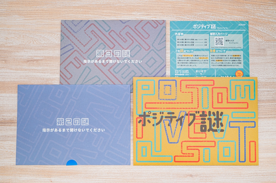 タイトル通り、前向きなワードや表現などのポジティブな要素がふんだんに詰め込まれた謎です。たくさんの"ポジティブ”に触れながら楽しく謎が解けるようになっています。また、成功体験を積み重ねるために、達成できそうな目標タイムを記入する欄があったり、謎を解くごとにポジティブになれる豆知識が手に入ったりと、解いていく内に自然と前向きになれる、とにかくポジティブな謎解き体験です。
