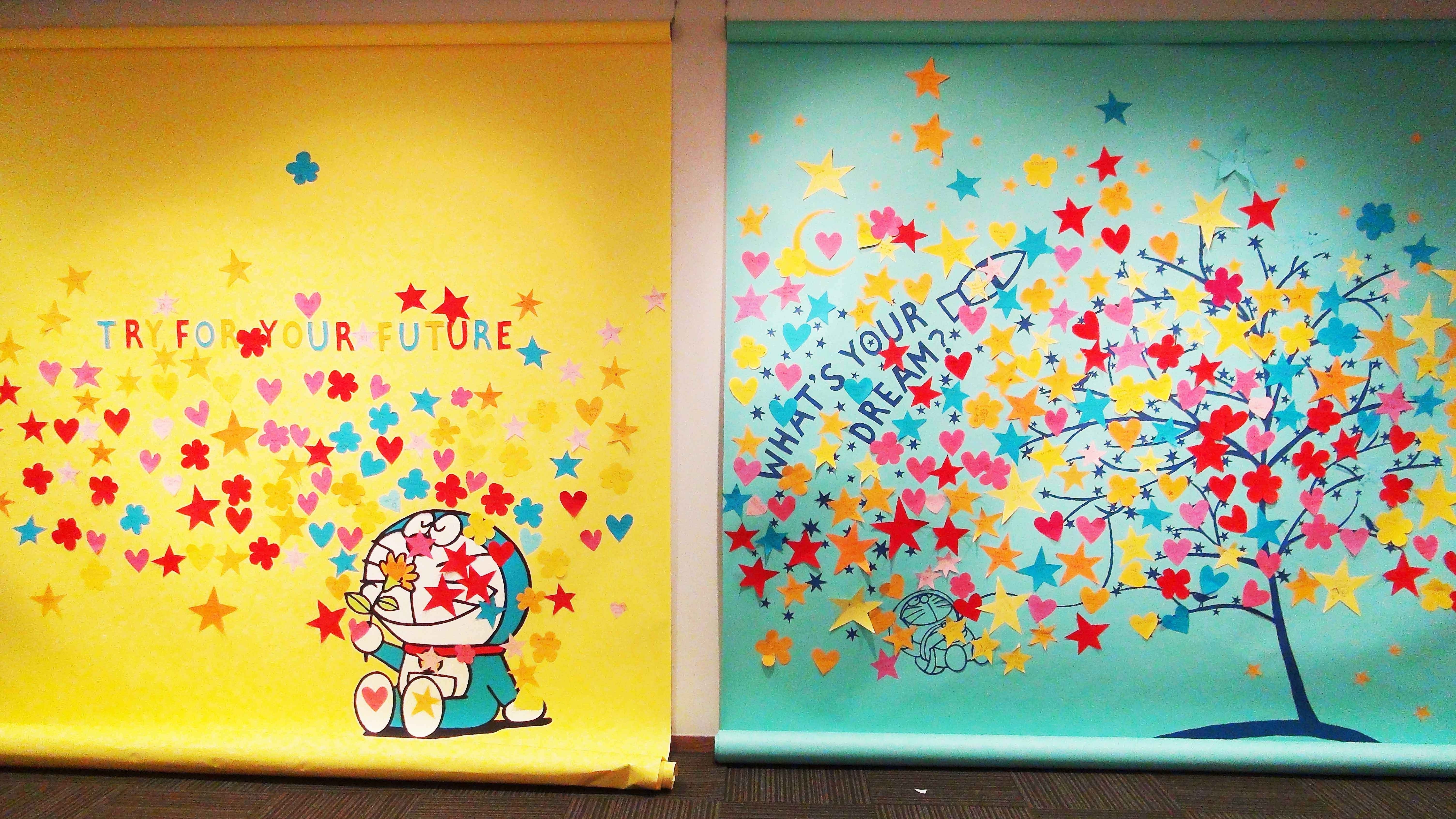 将来の夢は星やハートの形をしたカラフルな用紙に自由に書き込み、壁にかけられた2m四方の巨大な切り絵作品の中に貼っていただきました。切り絵作品は宇宙がテーマになっており、宇宙飛行士になっているドラえもんと大きな木が描かれています。