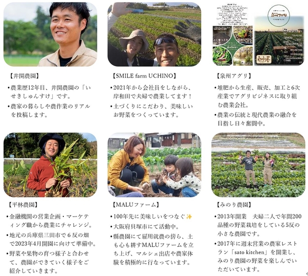 弊社では社会人向け週末農業学校「アグリイノベーション大学校」を11年運営してきました。当校では「あなたの農業人生が決まる」学校をテーマとして、ライフスタイル層・就農層・ビジネス層など様々な農業への関わり方をする卒業生を累計2000人超輩出しています。多様な農業の選択肢を持ち、自分らしい農業人生を過ごす方々が関西から農業の魅力を現在も発信しながら、豊かな生き方をされています。今回の「Farmer’s Diary」プロジェクトでも、卒業生や学校講師を務める農家さんなどが実証実験に参画してくれています。私たちの持つ農業ネットワークと、本プロジェクトを組み合わせながら、関西における多様な農業人生を過ごす方々の魅力発信のサポートをしてまいります。