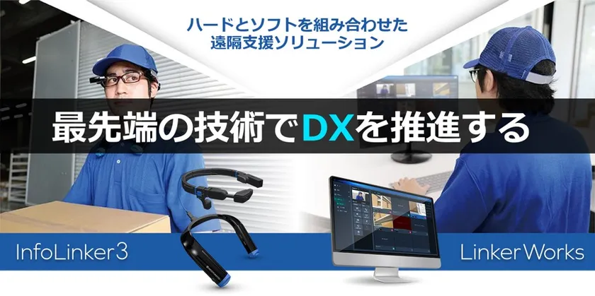 ウエストユニティスの「InfoLinker遠隔支援ソリューション」は、LTE搭載スマートグラス「InfoLinker3」と遠隔支援サポートツール「LinkerWorks」で構成される産業用スマートグラスソリューションです。「InfoLinker3」を活用した遠隔臨場と「LinkerWorks」による遠隔支援により、拠点にいる熟練者や指導者からスマートグラスを装着した作業員に対し、ディスプレイに表示される映像や音声を介して作業指示や指導をリアルタイムに行うことで現場のDX化を実現します。
