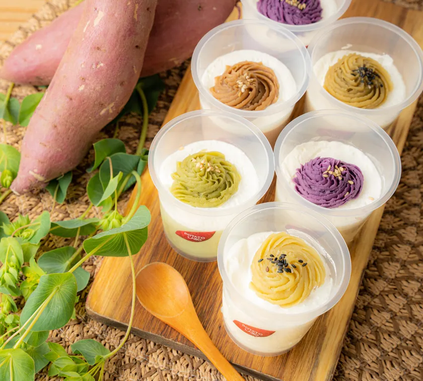 POTATO LABO お芋プリン 手前から:おいもプリン/抹茶お芋プリン/キャラメルお芋プリン/ショコラお芋プリン/ほうじ茶お芋プリン/紅芋プリン/