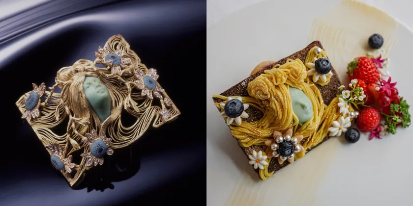 個性的で華やかな時代を思わせるジュエリーをモチーフに、パティシエが「食べるアートスイーツ」を考案。ラリックの作品を注意深く観察して出来上がったスイーツは、まるでお皿の上に作品が展示されているかのような精巧なつくりです。企画展実施中の期間、2種類の特別スイーツを施設内のOrient Express ティーサロンで提供します。