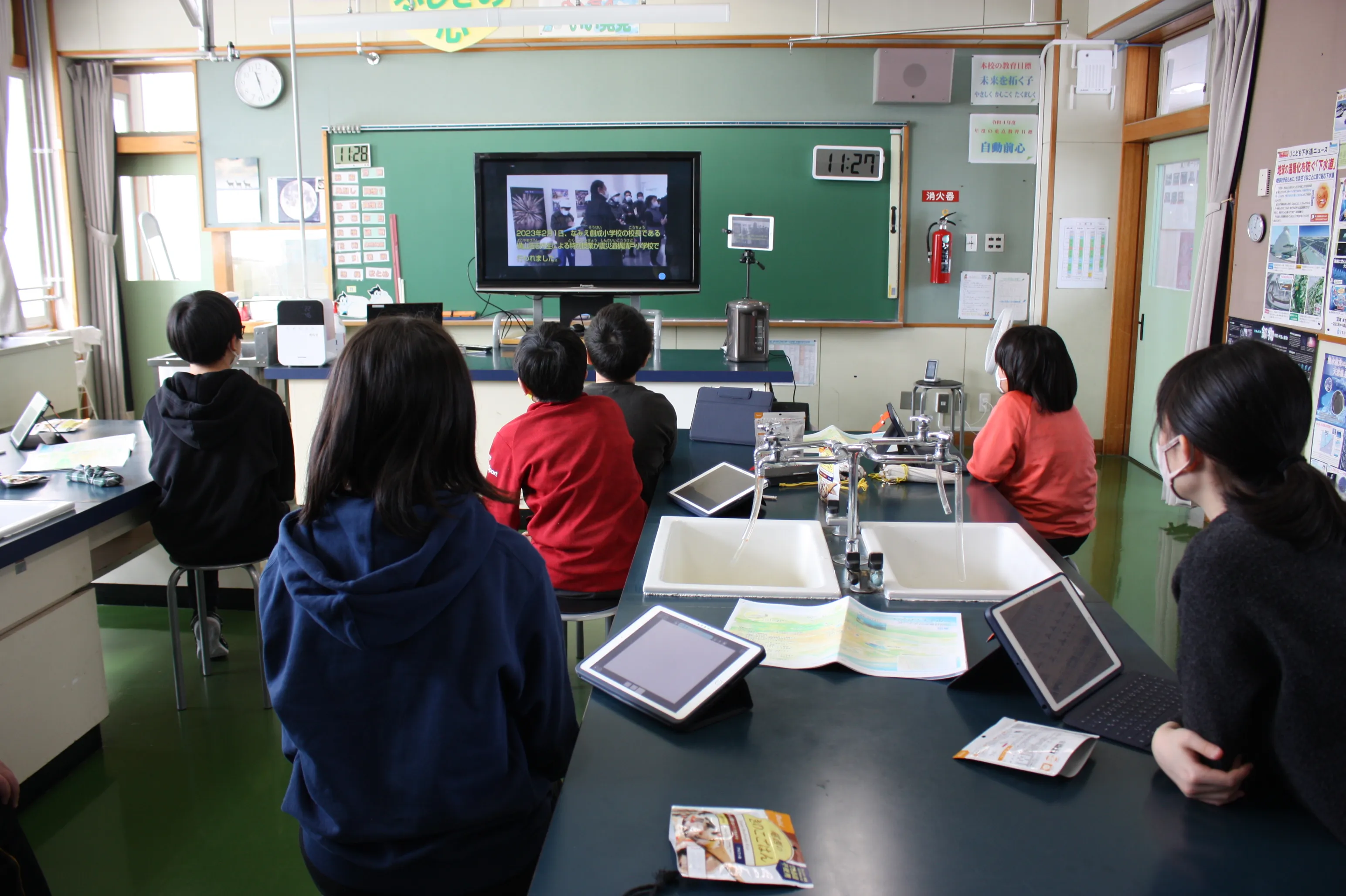 ※なみえ創成小学校の生徒による発表と小学校を結んだ話し合いの様子