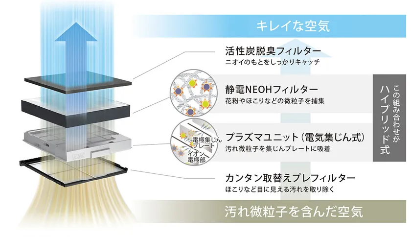 当機では、帯電させた金属板に汚れを吸着する電気集じん式と不織布で汚れを絡めとるフィルター式を組み合わせたハイブリッド式を採用しました。
