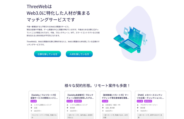 「Three Web」はブロックチェーン、暗号資産、NFT、DeFiなどのWeb3.0に関連するエンジニアに特化した求人サービスです。