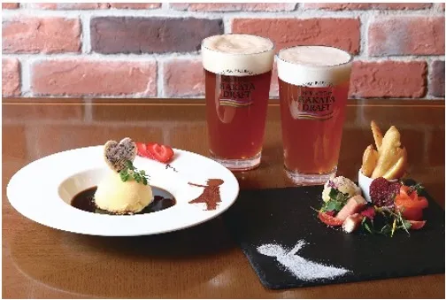 地下にある醸造所「オークラブルワリー」オリジナルの限定クラフトビールは、イギリスの伝統的なペールエールと苦味の効いたIPAの2種類。定番のフィッシュアンドチップスと前菜の盛り合わせはビールとの相性が抜群だ。バニラアイスに黒ビールをかけた大人のデザートは、風船をモチーフにしたイチゴがアクセント。