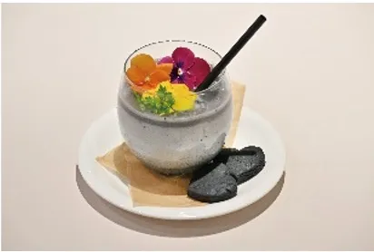 カッサータのフルーティーさとベリーソースの調和のバランスが取れており、味はしっかりしていてもスッキリ食べられ ます。ココアパウダーで少女を、 ベリーソースでバルーンを表現しています。