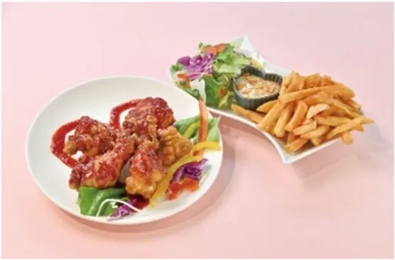 バンクシー発祥の地、イギリスのバルで人気のチキン&チップスと、赤のヤンニョンソースでバンクシーをイメージして います。