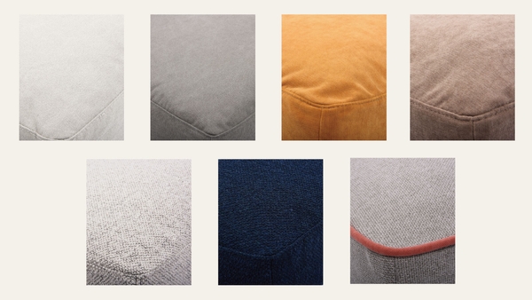 ソファカバーは4種類の生地とカラーバリエーションの全7種類の中からお選びいただけます。ベーシックなコットンポリキャンバス、マットな質感のベルベット、アパレルでもトレンドとなっているブークレを使った生地やパイピングの入ったコンビネーションの物など、季節やお好みに合わせてお選びください。