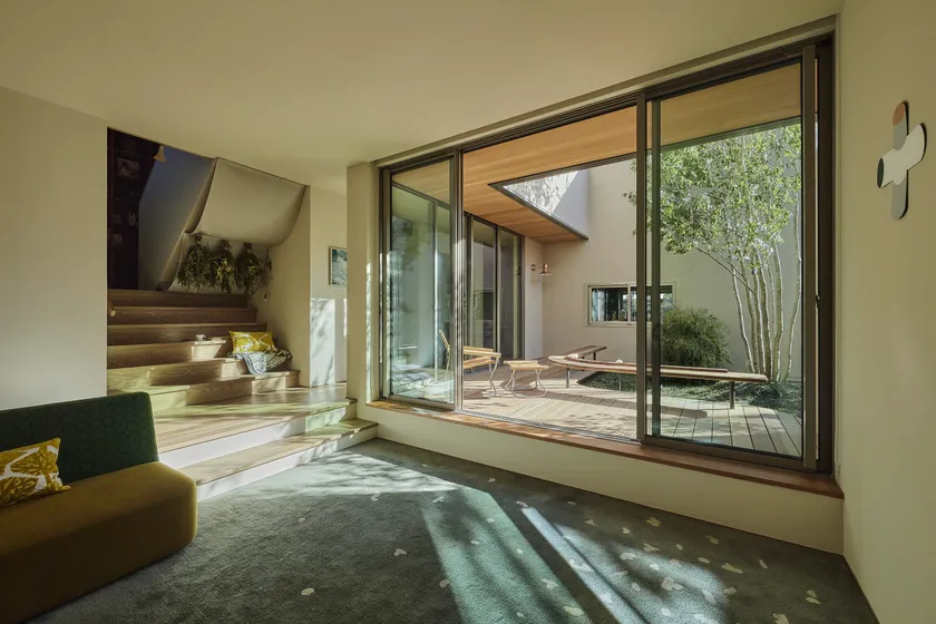 中庭を介して家族の気配を感じる木漏れ日のリビング