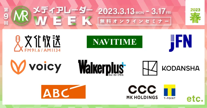 マーケティングセミナーイベント 「第9回 メディアレーダーWEEK* 2023春」 過去最大規模での開催決定! 広告・マーケティングの専門家が登壇 参加無料、先着順でお申し込み受付中!