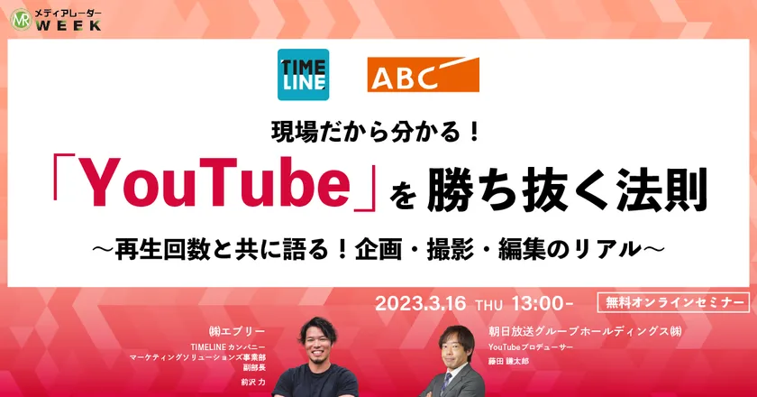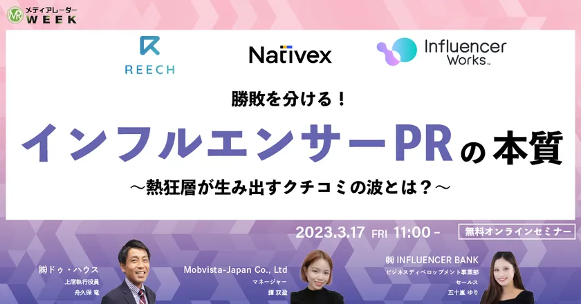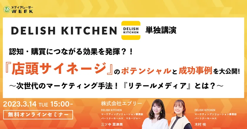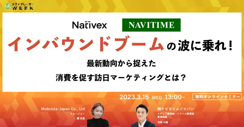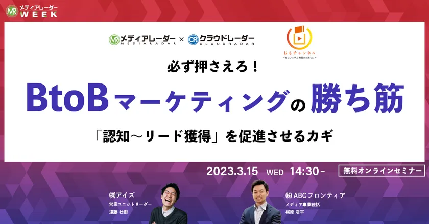株式会社アイズ(所在地:東京都渋谷区、代表取締役社長:福島 範幸、東証グロース:5242)が運営する国内No.1*の媒体資料ポータルサイト「メディアレーダー」は、2023年3月13日(月) ~ 17日(金)の5日間で、マーケティングセミナーイベント「第9回 メディアレーダーWEEK* 2023春」を開催します。様々なマーケティングジャンルの専門家たちが登壇するオンラインセミナーイベントで、参加申し込みは無料です。