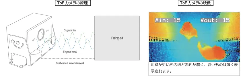 ToF(Time of Flight)カメラはカメラから赤外線を照射し、その反射光によってカメラと対象の距離を正確に取得することが可能です。同様の原理で ToF センサーというものがありますが、ToFカメラは 測定した距離データを映像に置き換え、画像解析( AI )と組み合わせることで、対象が人なのかモノなのか等を認識し、より正確に人数カウントを行うことができます。