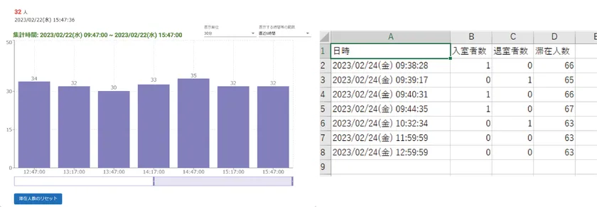 また、実際には入場者数・退場者数をカウントすることにより滞在人数を算出しておりますので、時間ごと・曜日ごとの来場者数を把握でき、集計データをCSV方式でエクスポートすることで、店舗/施設の運営管理にもお役立ていただけます。