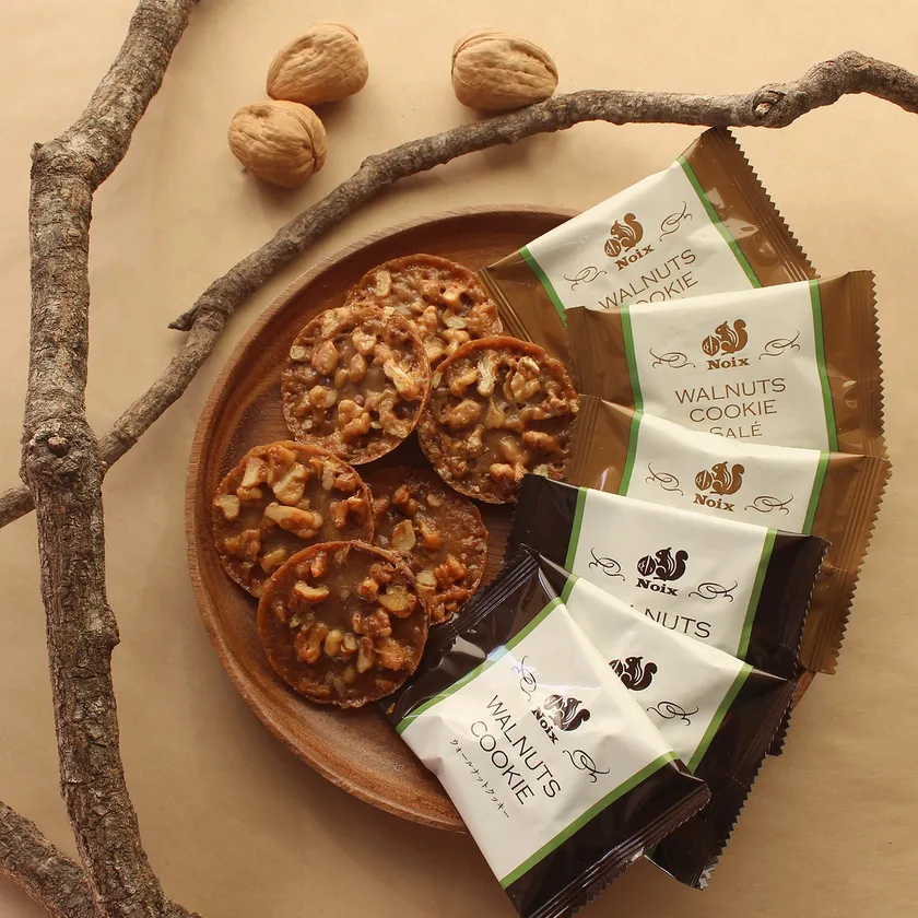 Noix(ノワ)の看板商品「ウォールナットクッキー」は、クルミをたっぷりと使った3層仕立ての新食感で、試食後の購入率はほぼ100%の人気商品です。