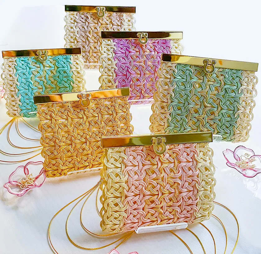 素材 :水引(紙/レーヨン糸/金銀糸)、口金(鉄)、内装(合成皮革:表面ポリ塩化ビニール100%/裏面レーヨン100%)