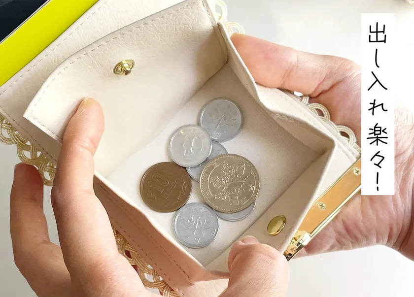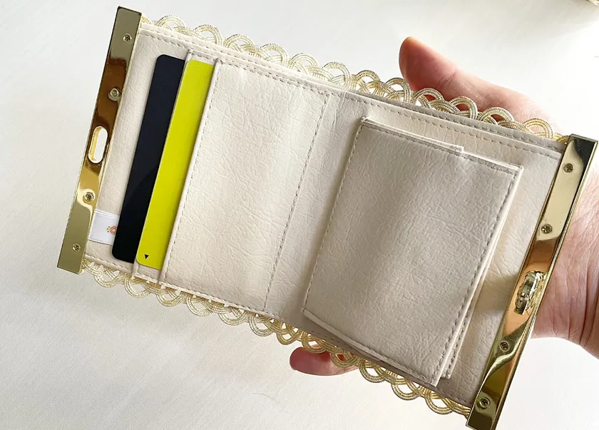 お財布の内装は、縫製士が手作業で心を込めてお作りします。取り出しやすいボックス型小銭入れ、カードポケット2ヶ所、お札を折らずに入れられるお札入れとコンパクトでありながら充分な機能を備えています。