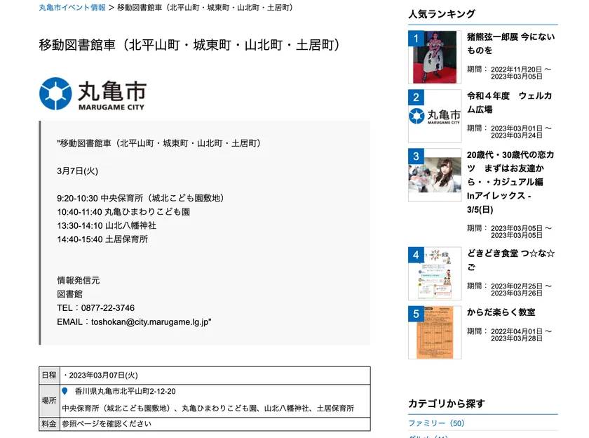 株式会社インフォモーション(本社:東京都目黒区、代表取締役:矢野 祐輔)は2023年3月15日(水)、丸亀市が、AIによる自動情報収集プログラムを用いたイベント情報配信サービス「丸亀市イベント情報集約サイト」の導入を開始したことをお知らせいたします。