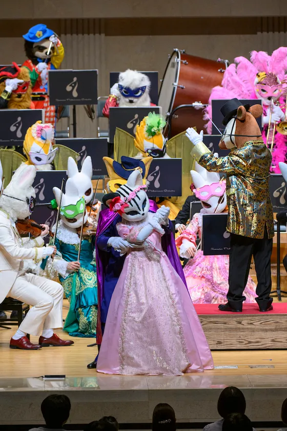 年に一度の舞踏会。動物たちはカーニバル衣装で登場します。花かんむりをつけたり、マントを着たり、それぞれおしゃれを楽しんでいます。特に女の子たちに人気なのはとっても華やかな弦うさぎの四姉妹のドレス。花柄の可愛らしい衣装が印象的です。クラリキャットの4名も色違いのロングドレスで登場。みんながヴェネツィアのカーニバルをイメージしている中、“カーニバル”違い…リオのカーニバルを彷彿とするサンバ衣装を着た動物も。本編中に撮影タイムも設けます。