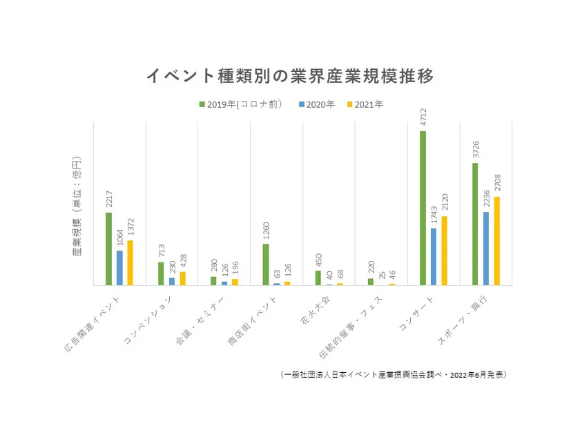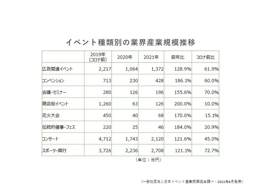2022年発表の調査によると、イベント業界全体の市場規模はコロナ前の6割に回復。特にコンベンションや会議・セミナーといったビジネス目的のイベントでは大きく回復しています。しかし商店街イベントや花火大会、伝統的催事などの消費者向けイベントや飲食を伴うイベントは以前として自粛傾向が続き今後の回復が期待されます。