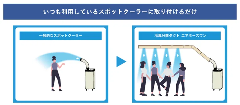 1人用のスポットクーラーで最大4人まで冷却できる! 新製品「冷風分散ダクト エアホースワン」を4月にリリース リテールテックJAPAN 2023にて初展示