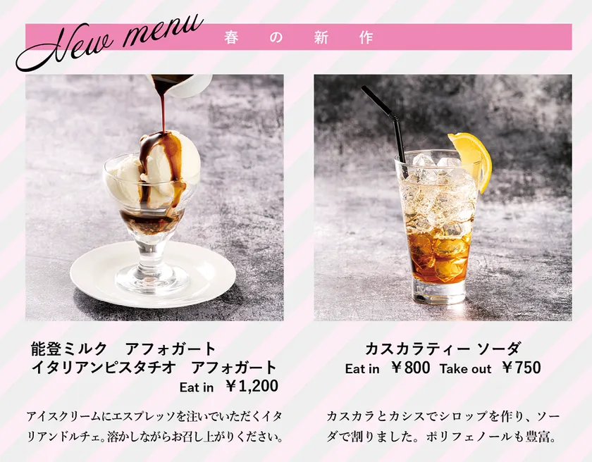 3人のプロフェッショナルが、暖流と寒流が流れ込む富山湾から着想を得て「温と冷による食味」を提案するメニューです。春の新作メニューでは、豊潤なエシレバターのクレープに、世界を制した柴野氏の「パイン×セロリ×リンゴのソルベ」を添えた新作クレープやふくよかな甘みがひろがる能登ミルクを使用したアフォガードやパフェ等、それぞれの素材の食味を活かしたマリアージュをお楽しみいただけるメニューをご用意しました。